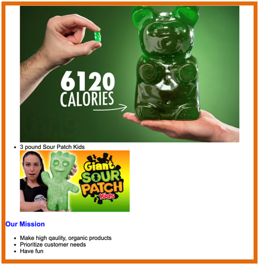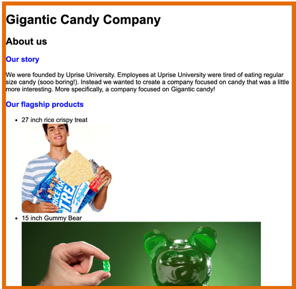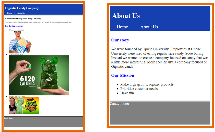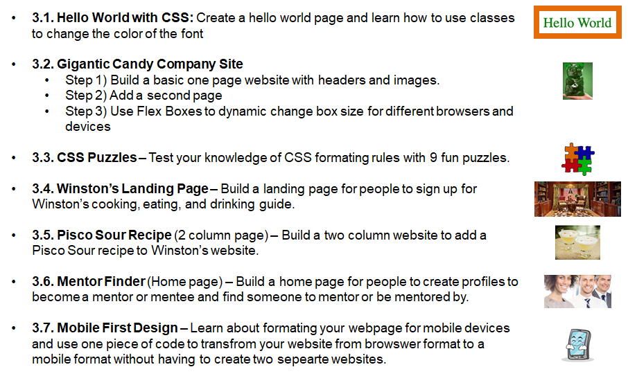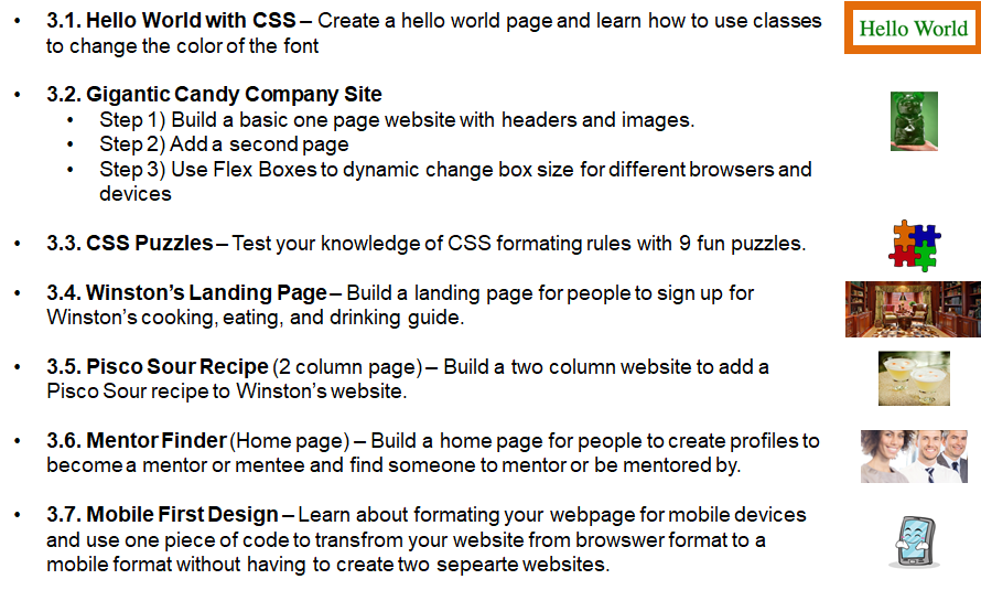 Coding 101: Lesson 3 - Your First Website Coding 101: Lesson 3 - Your First Website 3.0 Intro Lesson Overview HTML and CSS overview HTML tags and structure CSS intro and properties Boxes and layouts Mobile First Design and dynamic formatting Projects Overview Coding 101: Lesson 3 - Your First Website 3.1 HTML and CSS overview HTML is used to create the structure of your webpage (e.g., like the bones in your body) CSS is used to create the formatting and style of your webpage (e.g., like the skin of your body) Tags - HTML documents use to tell the browser how to format content. Pictures need tags, texts need tags, the entire website is made up of tags. Everything must be sandwiched within the tags. In the below code, <p> is the opening tag and </p> closing tag and this is used for a paragraph. You can write the content of your paragraph in between the tags. We can add some style to this pargraph using CSS in a separate .css file. We can make the font size 12 We can be more specific by using classes to distringuish between different paragraph lines. In HTML, Notes: Opening tag is <p> Attribute name is class and attribute value is ”greetings” Closing tag </p> We can then add some CSS to make all greetings green font and all feelings blue font Notes: Selector is .greetings Declaration block is {color:green;} Property name is color and property value is green Then link your html file to your CSS file using this code in your html file Project 3.1. Hello World! Try to create this before going to the next slide Coding 101: Lesson 3 - Your First Website 3.2 HTML tags and structure Key HTML tags and structure Other commonly used HTML tags and boilerplate code Project 3.2. Gigantic Candy Company Webpage (Step 1 of 3) Create a page that looks similar to following site Remember to use Separate css and html files Different types of HTML tags to break up and structure the site (e.g., <html>, <h1>, etc.) Starter code to avoid manually typing Coding 101: Lesson 3 - Your First Website 3.3 CSS intro and properties Cascading Style Sheets and how to use CSS = Cascading Style Sheet. It means that styles flow or cascades in order of what came last and what is most specific to that HTML element Source Order – whatever came last overrides what came before it Specificity Order – whatever is more specific overrides other style commands regardless of the Source Order (external less than specific than internal; p span is more specific than span) Inheritance – A child element will inherit any applicable styles from its parent HTML element Three ways to add CSS code: Using separate CSS files (Preferred method): External Style Sheets allow you to put all of your CSS code in one place and apply it to all of the pages in your website. Need to add below code between <head> tags of html <link href="normalize.css" rel="stylesheet"> Internal CSS: <style></style> For small projects you can use this to denote CSS is being used in between the tags; put inside your <head> file within HTML and add CSS between the style tags InLine / Embedded CSS: allows you to impact just one paragraph; not best practice to use. <p style=”color: green;”> fill in </p> Definitions Selector – this is the element that you want to change; for example, pargraphs in the following p {color:purple;} Property – what you want to change about your elements; for example, color in above example Value – what you want to change you element property too; for example, purple Detailed properties Font Properties font-family: “georgia”, “serif”; /* If Georgia font does not load, serif is back up */ color:blue; color:#630600; color: rgba(255,255,255,1); /* 0 to 255 for R,G, B and 0 to 1 for A transparency */ font-weight: bold; font-weight: 600; font-style: italic; font-size:16px; text-transform: uppercase; text-decoration: underline; font:bold 14px Tahoma; text-indent:25px; text-align: center; Background properties background-color: rgba(0,0,0,0.5); background-image: url("http:dash.ga.co/assets/anna-bg.png"); background-image: url(“../images/header_bg.jpg”); /* select image up one folder */ background-size: cover; background-repeat: no-repeat; background-repeat: repeat-x; /* Left Right Tile */ background-repeat: repeat-y; /* UpDown tile */ background-position: 10px 60px; /* Change starting position */ background-position: 50% 60px; /* Change starting position */ Floating properties img {float:right;} /* Element float images to right or left or none */ p {clear:none;} /* Allows floating elements on both sides; This is default */ p {clear: left;} /* No floating elements allowed on left side; can use right or both */ p {clear: inherit;} /* Element inherits the clear value of its parent */ HTML element properties max-width: 500; /* Allows website to be responsive & have 500 max width */ width:60%; height:5%; Other properties ol { list-style-image:url(checkmark.jpg); } /* Custom Bullet points */ Google Fonts: Allows you to easily import different types of fonts Go to Google Fonts - https://fonts.google.com/ Click the plus sign on the fonts you want to add Click the minus sign next to the “family selected” tab There will be instructions on what code to add to the HTML section and the CSS code CSS Selectors p { } /* Type - selects all elements of specified type (e.g., p elements) */ * { } /* Universal - selects all elements in html file not selected by other selectors */ #myID { } /* ID - are supposed to singular and unique to allow you format a specific element */ .class { } /* Class – similar to ID but for formatting multiple elements at same time */ /* Note HTML elements can have multiple classes */ h1, h2, #myID { } /* Compound - format multiple selectors at same time body article p { } /* Descendent - element that is nested inside of specified parent element */ a:link /* Pseudo class - links in their default state before visitor has interacted with them */ a:visited /* Links after user has already clicked on them and is visiting tha